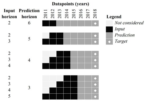 It should be noted that the further the predictions extend into the future, the greater the errors become. The calculated error depends on the duration of the input horizon and the prediction horizon. For this reason, an experiment is conducted that tests the performance for multiple combinations, as shown in Figure 12. For the experiment, first, a prediction horizon is set. Then, for a given prediction horizon, different input horizons are considered, starting from two data points away from the beginning of the prediction horizon, all the way to the maximum number of possible data points. Following the same principle, different prediction horizons are considered. Figure 12 presents the schematic representation of the scenarios considered in this experiment.
