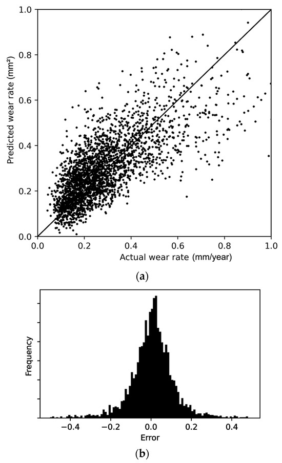 Figure 13a presents the scatterplot of the predicted wear rate against the actual wear rate for the linear regression model. As shown in this figure, the predictions have a relatively small error for the lower wear rates. When the wear rate increases, the predictions become slightly less accurate. Figure 13b shows the distributions of errors. The fact that the histogram suggests a normal distribution of errors is an indication that the model captures the overall trend in a balanced manner.