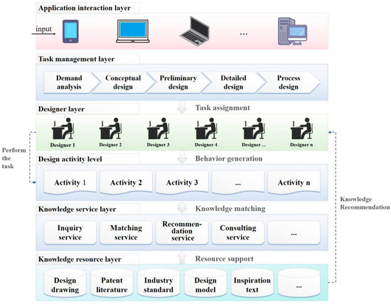 The entire service process is received by the application interaction layer from the information input by the designers. And the task management layer decomposes design tasks into distinct phases and assigns them to multiple designers at the designer layer. When designers perform specific design activities, they generate diverse knowledge demands, and the knowledge service layer responds by providing matching, recommendation, and consultation services to support these activities. The underlying knowledge resource layer stores and manages a wide array of design knowledge resources, encompassing design drawings, patent documents, and industry standards. Each layer is executed step by step, according to the upper-level task instructions, while low-level knowledge resources are injected back into the design activities through intelligent matching. Additionally, real-time behavioral data is generated, which sustainably optimizes the task allocation strategy and knowledge push algorithm, thereby achieving coordination among demand, task, behavior, and knowledge.