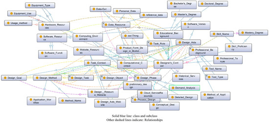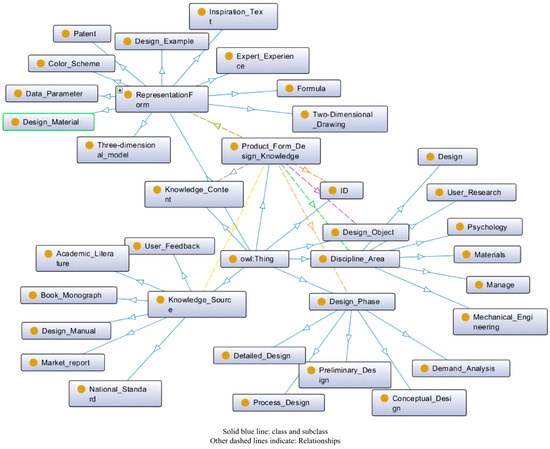 The types of knowledge involved in the field of product form design encompass design drawings, patents, research reports, industry standards, product specifications, design tools, inspirational texts, symbolic elements, color schemes, and other relevant information. At the same time, owing to the characteristics of cloud design and the interdisciplinary nature of product form design, the knowledge of product form design is complex, dynamic, and intricate. In order to enhance the utilization rate of product form design knowledge, we build a knowledge ontology model using OWL, thereby facilitating the standardized representation of product form design knowledge and enabling efficient management and rapid push, as shown in Figure 4.