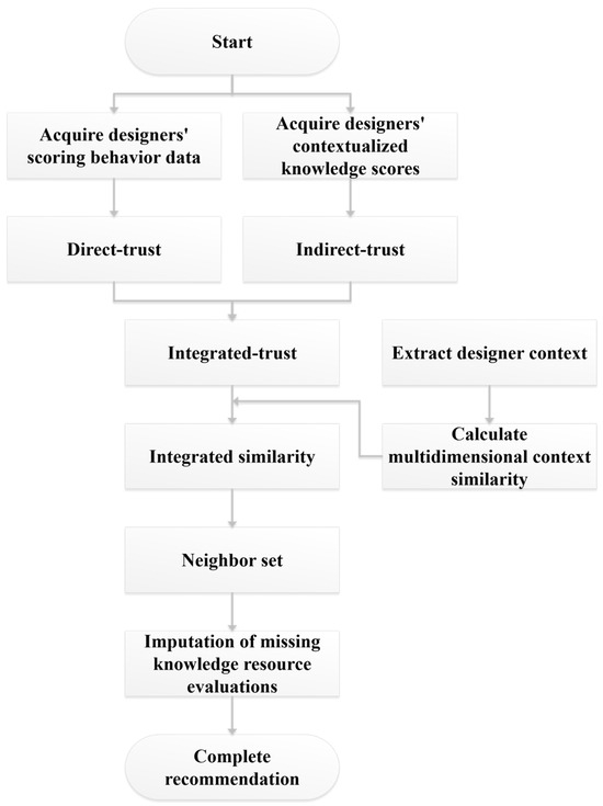 Finally, the target designer’s nearest neighbors are identified by combining comprehensive contextual similarity and trust metrics. These neighbors’ knowledge scores then impute missing values for the target, enabling personalized knowledge recommendations through a generated prediction list. The algorithm framework is shown in Figure 5.