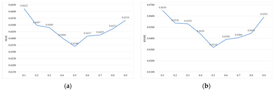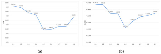 As can be seen from Figure 7, with the increase in the value of , the MAE and RMSE values tend to decrease initially and then increase overall. When , the MAE and RMSE values gradually decrease. When , the MAE and RMSE values gradually increase. When , the MAE and RMSE values are the smallest, indicating that the algorithm performs best at this point. Therefore, the optimal value for the comprehensive-similarity weight coefficient is 0.5.