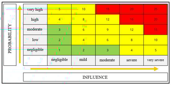 11]. However, in the construction industry, risk is commonly quantified as the product of the probability of its occurrence and the severity of its consequences (P × I), which serves as a practical basis for prioritizing and managing risks. Risk is measured as a combined probability of a predicted threat or opportunity becoming a reality and the degree of its possible impact on the goals and assumptions of a project. Setting the context aside, risk is strongly related to uncertainty and the notion of randomness [