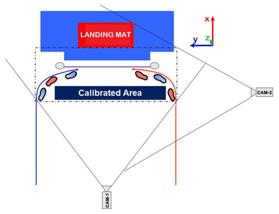 The jumpers’ attempts were recorded using two fixed digital cameras (Samsung Galaxy S6 and Samsung Galaxy S7 Edge smartphones, Samsung, Incheon, Republic of Korea), which operated in full high definition mode (resolution: 1920 × 1080 px) at a recording frequency of 60 fps and a shutter speed of 1/2000. The selected sampling frequency is in agreement with past research on similar examinees [29]. The cameras were placed on fixed tripods according to the arrangement shown in Figure 1 and at a height of 1.47 m from the ground. The distance of the cameras from the base of the right upright post was 28.0 m. The cameras were zoomed in to have a recording view adequate to capture the following phases of the high jump technique: the last step of the approach, the take-off, the crossbar clearance, and the landing on the mat. The synchronization of the videos was performed using the recorded audio signals via the corresponding function of the analysis software (A.P.A.S. v.14.1.0.5, Ariel Dynamics Inc., Trabuco Canyon, CA, USA) as a reference.