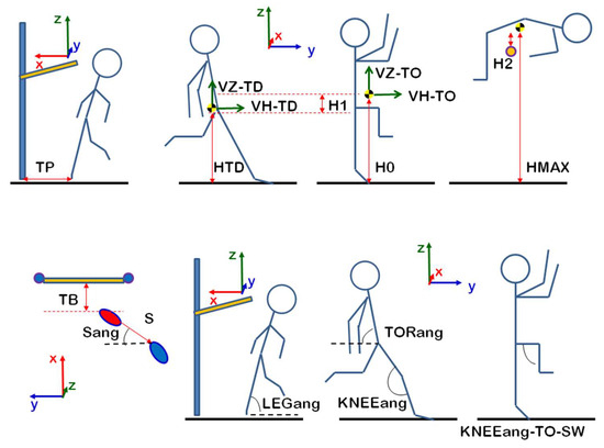 Schematic representation of the examined parameters. TP: the distance between the toes of the take-off leg and the respective upright post; VZ-TD: the vertical body center of mass (BCM) velocity at touchdown; VH-TD: the horizontal BCM velocity at touchdown; HTD: the BCM height at touchdown; VZ-TO: the vertical BCM velocity at take-off; VH-TO: the horizontal BCM velocity at take-off; H0: BCM take-off height; H1: the vertical BCM displacement from the time of take-off to the highest point of its trajectory; H2: the vertical distance between the crossbar and the highest point of the BCM trajectory; HMAX: the maximum height of the BCM trajectory; TB: the distance between the toes of the take-off leg and the center of the crossbar; S: the length of the last step; Sang: the direction of the step with respect to the longitudinal axis of the crossbar; LEGang: the inclination of the take-off leg at touchdown; TORang: the inclination of the torso at touchdown; KNEEang: the angle of the knee joint of the take-off leg; KNEEang-TO-SW: the angle of the knee joint of the swing leg at take-off.