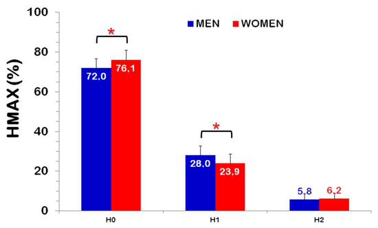 Figure 3 depicts H0, H1, and H2 as percentages of HMAX. Significant sex differences were found for H0 (t40 = 2.750, p = 0.009, d = 0.85, large effect size) and H1 (t40 = 2.750, p = 0.009, d = 0.85, large effect size), but not for H2 (t40 = 0.499, p = 0.620, d = 0.15, trivial effect size).