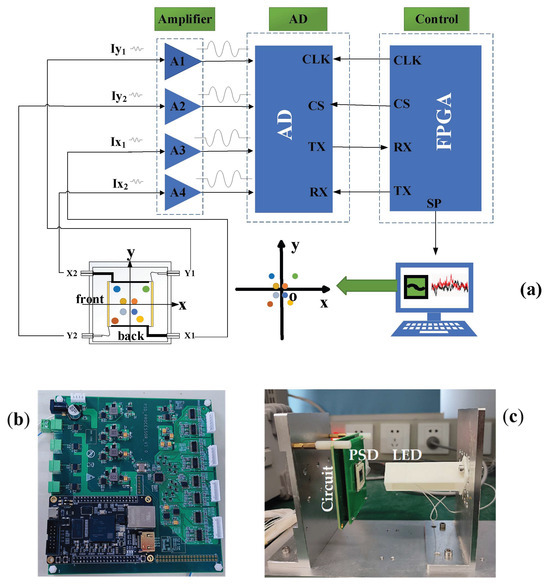 (a) Schematic of a 2D PSD and the self-designed condition circuit. (b) A photo of the self-designed condition circuit. (c) The PSD-based sensing system used to demonstrate the self-designed condition circuit. AD: analog-to-digital converter; FPGA: field programmable gate array; CLK: clock; CS: chip-selecting; RX: receiver; TX: transmitter; SP: serial port.