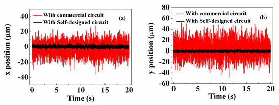 Variation in the position of the light spot on the PSD with time measured using the self-designed condition circuit and a commercial condition circuit: (a) in the x direction and (b) in the y direction.