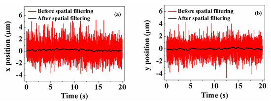 We characterized the precision of our system. We aligned the light spot to the center of the PSD and then acquired the output of the PSD for about 20 s with the use of our self-designed condition circuit. We also acquired the output of the PSD employing a commercial condition circuit with the same time period for comparison. We obtained the position of the light spot on the PSD according to Equations (1) and (2), where Vx1, Vx2, Vy1, and Vy2 are the voltage converted from the output current of the PSD and L is half of the width of the PSD. Figure 2a and 2b, respectively, show the measured light-spot position using the two-condition circuit in the x direction and y direction. It can be seen that the variation in the spot position measured by the commercial circuit is much larger than that measured by our self-designed circuit in both directions. The standard deviation was about 8.4 μm in the x direction and 14.2 μm in the y direction for the commercial circuit, while these values were 1.3 μm in the x direction and 1.1 μm in the y direction for the self-designed circuit. The corresponding 3-sigma precision was about 25.2 μm in the x direction and 42.6 μm in the y direction for the commercial circuit and 3.9 μm in the x direction and 3.3 μm in the y direction for the self-designed circuit. Our circuit improves the precision almost by an order of magnitude. We then employed a Butterworth low-pass filter with a cut-off frequency of 1 Hz to further improve precision. Figure 3a and 3b, respectively, show the light-spot position when using the filter together with those without using the filter in the x direction and y direction. The precision in both directions was about 0.3 μm when the filter was used. With the use of the Butterworth low-pass filter, the precision effectively improved. Thus, in the following measurement, the self-designed driven circuit and Butterworth low-pass filter were used.