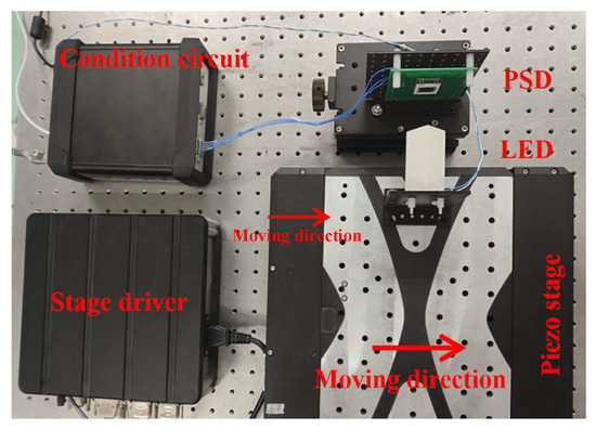 We estimated the resolution of our displacement measurement system. The schematic of the setup for this estimation is shown in Figure 4. We put the light source on a piezo stage (L-731.4ASD, Physik Instrumente, Karlsruhe, Germany) with a unidirectional repeatability of 50 nm and the PSD on the optical bench. We aligned the light source so that the output beam was incident on the area near the center of the PSD, which was the actual start point. We set a displacement and velocity value for the piezo stage. We controlled the stage to move in steps in the negative x direction and used the PSD to acquire the signal simultaneously. The measurement continued for 20 s after the displacement was finished. The above process was repeated 11 times. Similarly, we conducted the measurement in the y direction by rotating the PSD by 90°. We conducted this measurement on the area near the center of the PSD, although the measurable displacement range of the system was 8 mm, which was calculated by subtracting the spot diameter from the size of the PSD sensor. This is because the non-linearity in the center area is generally smaller than that in the outer area; thus, an accurate position of the light spot was obtained without any calibration. By subtracting two adjacent positions of the light spot, the displacement of the LED was achieved.