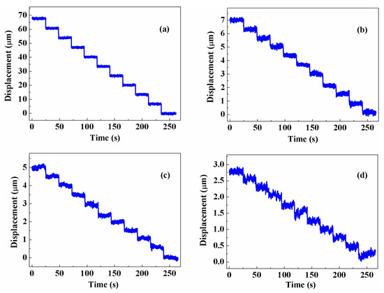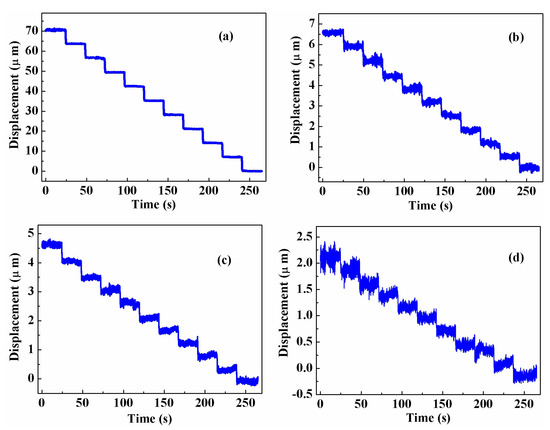 Displacement measured by our system after annealing when the step size was set to (a) 7 μm, (b) 0.7 μm, (c) 0.5 μm, and (d) 0.3 μm.