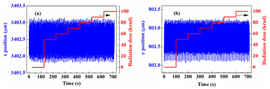 We tested the performance of our displacement measurement system when exposed to 60Co radiation. The experiment was performed at the Institute of Low-Energy Nuclear Physics at Beijing Normal University. The 60Co source was a single-grid planar source placed in a water well, which had a radioactivity value of 3.7 × 1014 Bq. Its dose rate was calibrated using Fricke dosimeters, both from Beijing Normal University and the National Institute of Metrology [28]. The total uncertainty of nominal doses was estimated at ±2% (2 sigma). We set the radiation dose from 50 krad to 100 krad with a step size of 10 krad. This dose range was chosen because components at high orbits generally have to withstand a total irradiation dose of 100 krad, and components that can only withstand a total irradiation dose below 50 krad are hardly considered at high orbits. The step size was chosen to ensure sufficient data points while maintaining time efficiency. The distance between the 60Co source and our system was about 15 cm. Initially, we measured the system’s precision in this experimental platform with the 60Co radiation source turned off. The 60Co radiation source was raised to the experiment platform when it was turned on. We measured precision at each dose step for 100 s to fully study the effect of 60Co radiation on precision. Figure 6a depicts the variation in radiation dose and the corresponding spot position in the x direction with time. When the 60Co radiation source was turned off, the standard deviation and precision were 0.22 μm and 0.66 μm. When the radiation dose was set from 50 krad to 100 krad, the precision was hardly affected. Figure 6b depicts the variation in radiation dose and the corresponding spot position in the y direction with time. The standard deviation and precision were 0.18 μm and 0.54 μm at the beginning and were not affected when the 60Co radiation source was turned on. Here, the precision was a little higher than that measured above; this is probably because it is difficult to completely block environment light and isolate environment vibration. Our system has good resistance to 60Co radiation.