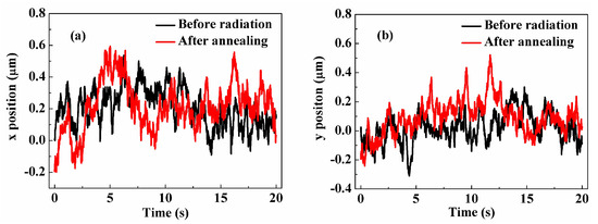 Variation in the position of the light spot on the PSD with time measured after 48 h of annealing and before radiation: (a) in the x direction and (b) in the y direction.
