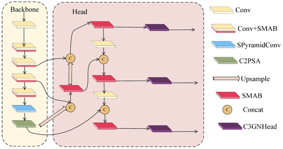 SPyramidLightNet follows the classical encoder–decoder design paradigm, comprising two core components: a backbone network and detection head. The backbone employs a progressive feature extraction strategy, achieving efficient multi-scale feature extraction through multiple convolutional layers and the innovatively designed SMAB module. Specifically, the SMAB module enhances feature representation capability while significantly reducing parameters through dynamic mixed convolution and split–merge attention mechanisms. The SPyramidConv module implements refined and efficient multi-scale feature aggregation via a parameter-sharing multi-dilation-rate convolutional architecture. The C2PSA module further strengthens the network’s global context modeling capability.