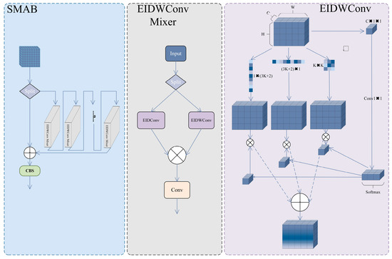 As illustrated in Figure 2, the core design philosophy of the SMAB module centers on efficient feature learning through a split-process-merge strategy, primarily comprising two key components: Enhanced Inception Depthwise Convolution (EIDWConv) and EIDWConv Mixer. The module’s forward propagation process can be described as a multi-stage feature transformation sequence: first splitting the input feature map along the channel dimension, then extracting features through parallel multi-scale convolutional branches, and finally completing information integration through attention-guided feature fusion.