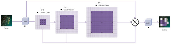 In this context, denotes the shared convolution weights utilized by all dilation branches, while indicates the dilation rate for the i-th branch. The dilated convolution can be mathematically expressed as:
