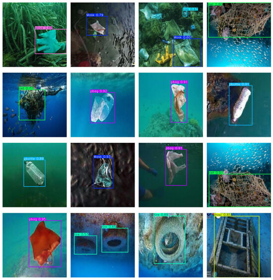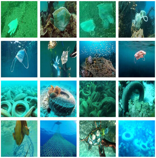 Image acquisition covers diverse underwater environmental conditions, including varying water depths, illumination levels, water clarity, and seabed topography. Image resolutions range from 640 × 480 to 1920 × 1080, authentically reflecting typical underwater challenges: low contrast from light attenuation, image blur caused by water scattering, color distortion, and complex background interference. As illustrated in Figure 5, plastic debris dominates the dataset in terms of category characteristics. Metal debris exhibits relatively clear boundaries but is easily confused with seabed rocks. Electronic waste presents complex and varied shapes. Irregularly shaped debris such as fishing nets highly blend with the seabed environment, posing detection challenges.