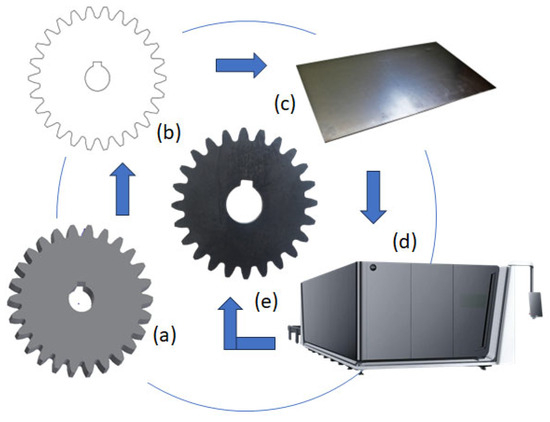 The cutting phase (d) was carried out with a BODOR C6 laser, which provides high accuracy, good reproducibility, and high-quality edges after processing. The final product (e) is a gear manufactured by laser cutting. As shown in Figure 1, the schematic of gear production using laser cutting is presented.