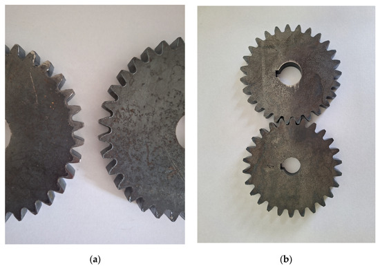 (a) Spur gear after the cutting process (right), spur gear after preparation for measuring (left). (b) Laser-catted spur gear pair.