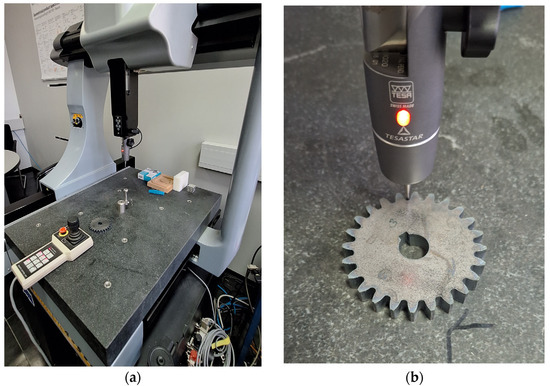 Comprehensive three-dimensional measurements were performed using a TESA (Renens, Switzerland) Micro-Hite coordinate measuring machine [22], shown in Figure 5a along with PC-DMIS GEAR 2.5 software [23], which allows comparison with ideal theoretical profiles in accordance with ISO 1328-1 [12]. The TESA Micro-Hite machine is equipped with a TESA-Star probe that uses a tactile stylus to locate points on the gear surface, enabling high accuracy in gear measurements. All measurements were conducted in laboratory conditions under controlled environmental influences: temperature maintained at 20 °C, a prepared and clean work surface, and the absence of noise and vibrations. These conditions ensured the precision of measurements for each individual gear. Figure 5b illustrates the measurement procedure on one of the gears. The image shows the measurement stylus making precise contact with the tooth flank, while the software automatically records the measured value.