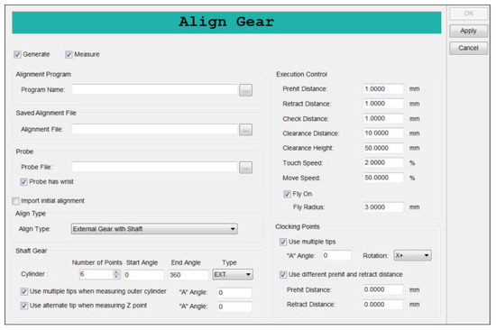 For the purposes of this study, the PS-DMIS GEAR 2.5 software package developed by Hexagon Manufacturing Intelligence was used. This software is specialized for the measurement of gear geometric parameters and features a high degree of automation, making it suitable for evaluating various gear characteristics such as pitch deviations, tooth profile deviations, gear tooth thickness, and more.