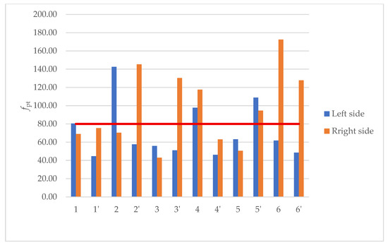 Blue bars represent the measured deviations on the left flank of each tooth, while orange bars represent the deviations on the right flank. The red horizontal line at y (fpt) = 80 µm marks the maximum allowable deviation for a gear to meet the Q12 quality level according to the applied standard [12].