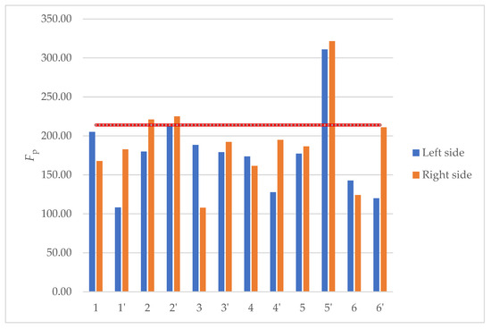 Diagram of maximum individual pitch deviations for all measured gears: left and right flanks of the tooth. The red horizontal line marks the maximum allowable deviation for a gear to meet the Q12 quality level according to the applied standard.