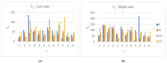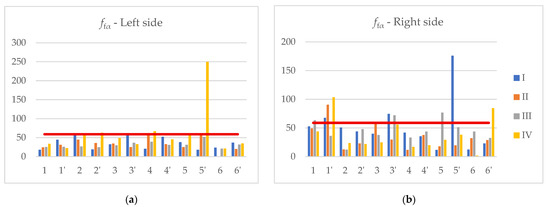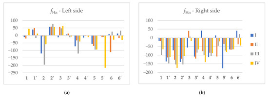 Figure 10, Figure 11 and Figure 12 present diagrams of gear profile deviations, specifically profile form deviation, profile angle deviation, and total profile deviation, respectively. The values shown were measured for the left flanks of the teeth (a) and the right flanks of the teeth (b) for each manufactured gear.