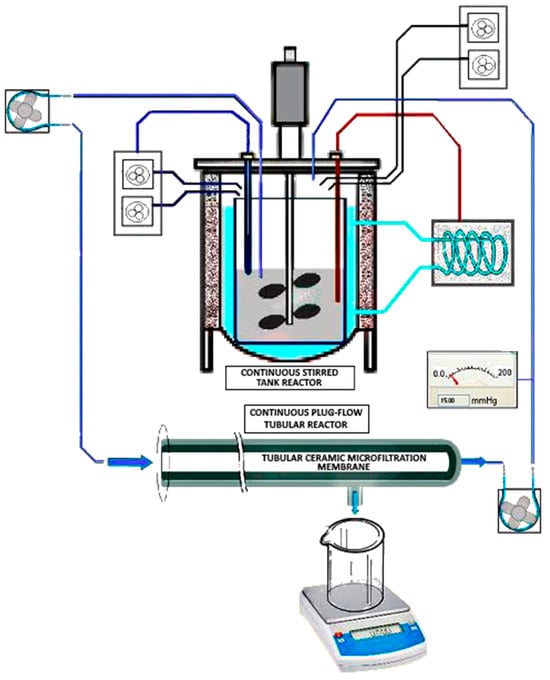 The SimuGIT, shown schematically in Figure 2, consists of a continuous stirred-tank reactor (CSTR) and a continuous plug flow tubular reactor (PFR) equipped with a single-channel tubular ceramic membrane of a given cut-off size, both connected in series [,]. Each of its parts is described in detail below.