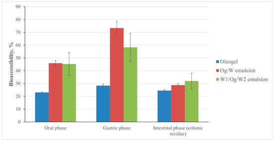 Figure 3 comparatively represents the bioaccessibility percentages of vectorized curcumin among the three different delivery systems after the oral, gastric and intestinal phases (colonic residue). As can be seen, these percentages were nearly of the same order of magnitude for both emulsified systems (Og/W emulsion and W1/Og/W2 emulsion) and significantly different between them and the pure oleogel system.