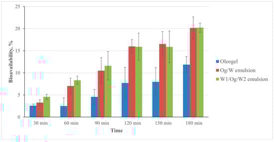 On the other hand, Figure 4 comparatively represents the curcumin bioavailability percentages at different times (between 30 and 180 min) for each delivery system during the intestinal absorption phase. Based on that, we can observe how the bioavailability percentage of the curcumin vectorized in the pure oleogel matrix was the lowest regardless of the time considered, although it is true that said percentage increased from 2.6 ± 0.4% (30 min) up to 11.9 ± 1.8% (180 min). Additionally, it can be seen how the absorption rate of curcumin was somewhat slower especially during the first hour. However, the encapsulated curcumin in the Og/W and W1/Og/W2 emulsified systems showed very similar bioavailability percentages at the end of the intestinal phase (180 min, around 20.2 ± 2.5%) and much higher percentages than those of the oleogel (1.7 times higher) (p < 0.05). Comparing both emulsified systems during the first 90 min of the intestinal absorption phase (early absorption phase), the W1/Og/W2 emulsion reached slightly higher percentages of bioavailable curcumin (between 1.1 and 1.3 percentage points) than those of the Og/W emulsion; however, between 120 and 180 min (late absorption), the bioavailability percentages were very similar. This fact means that the curcumin encapsulated in the multiple emulsion was absorbed more quickly than the curcumin vectorized in the simple emulsion, whose greater absorption occurs after a longer amount of time. This could be related to the greater or lesser physical stability of both delivery systems under physiological conditions and the fact that, as already described, a hetero-dispersed structure has many more breakdown mechanisms (swelling, shrinkage, etc.) than a simple emulsion. Thus, as previously mentioned, the composition of the intestinal fluids (remember that intestinal fluids are composed of a large amount of electrolytes) contributes to increasing the osmotic pressure of the external aqueous phase of the multiple emulsion, giving rise to an imbalance between the osmotic pressures of the internal and external aqueous phases and, consequently, accelerating the physical destabilization of the W1/Og/W2 emulsion and the release of the dispersed phase contained therein with respect to the Og/W emulsion. This fact explains the difference observed between the percentage of bioavailability of curcumin vectorized in both emulsions over time. In any case, it can be seen that the final bioavailability values reached (11.9 ± 1.8% for the pure oleogelified system and 20.2 ± 2.5% for the emulsified ones, p < 0.05) were always higher than the 7.8% (greater by a factor of 2.5) reported in the literature for free curcumin dissolved in corn oil using a different simulated gastrointestinal model [].