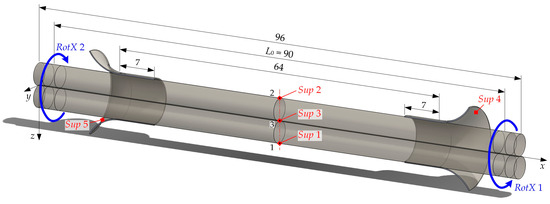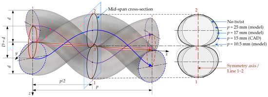 = 90 mm, Equation (3) shows that twisting down to the minimum investigated pitch of 10.5 mm results in a shortening of 32.3 mm, which is a significant value and must be taken into account when defining the supports. The influence of pitch