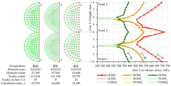 Figure 9 presents three of the tested mesh configurations. They differ in both the type of finite elements and in the number of nodes along Line 1–2. The R6Q mesh uses 20-node