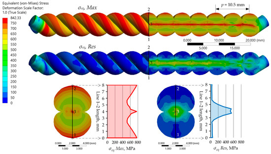 Figure 12 shows the residual stress diagrams along Line 1–2, obtained after deactivation of the applied torque and unloading of the twisted pair. The stress values at the surface (Points 1 and 2) are relatively low and do not exceed 100 MPa. Given the complexity of the stress state and the stress distribution in the cross-sections, the use of von Mises equivalent stress is appropriate for further analysis.