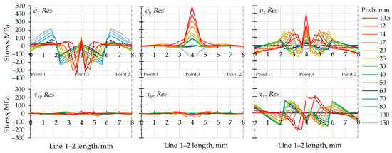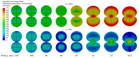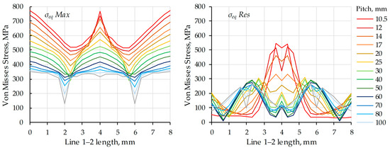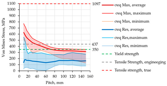 Simulations were performed using the described FEM model for 14 different pitch values: 10.5, 12, 14, 17, 20, 25, 30, 40, …, 150 mm. Distributions and diagrams of von Mises equivalent stress