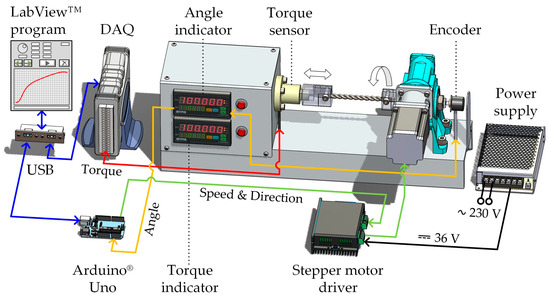 For the purposes of the present study and to achieve high measurement accuracy, the torque sensor was connected directly to a DAQ module (Adlink® USB-2401 (ADLINK Technology Inc., Taipei, Taiwan)), which is specialized for strain gauge measurements. The corresponding digital indicator of the testing machine was temporarily disabled. The information on the twist angle was transmitted from the machine’s indicator to the Arduino® Uno. Both the microcontroller board and the USB-2401 DAQ communicate with a personal computer via USB.