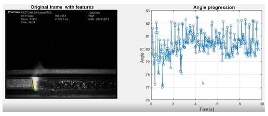 - Capillary front wall inclination:It is known that the capillary front wall exhibits a change in its angle as the workpiece experiences a translative motion relative to the incident laser. To be able to quantify the same, a MATLAB code was written to reduce the noise in the video playback and binarize the frame data to highlight the vapour capillary. The code then identified the left boundary of the capillary and used the RANSAC algorithm to fit a line to the identified boundary points, as seen in Figure 4. The slope of the line was then plotted per frame. An angular constraint between 60°and 90° from the horizontal was set to avoid fluctuations arising due to noisy data.