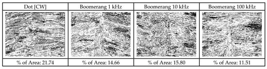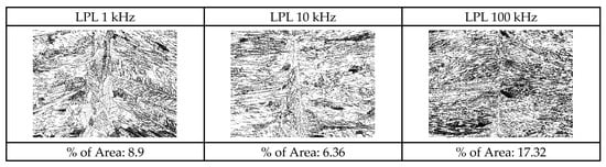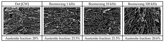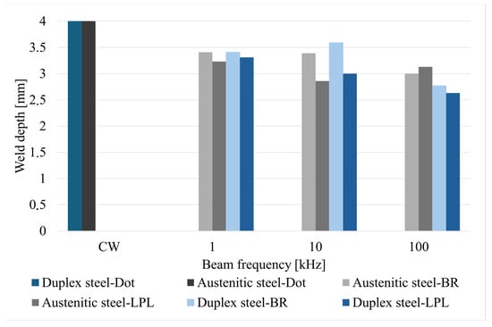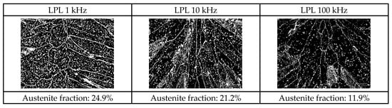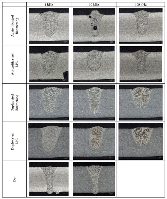 - Microstructure and Weld Geometry:Metallographic cross-sections revealed beam shape and frequency-dependent changes in weld morphology and phase composition. In austenitic steel, higher frequencies promoted grain coarsening, while in duplex steel, increased frequency shifted the ferrite–austenite balance toward ferrite. Weld geometry transitioned from narrow–deep to wide–shallow in duplex steel with LPL beam shapes, whereas the opposite trend was observed in austenitic steel.