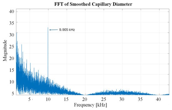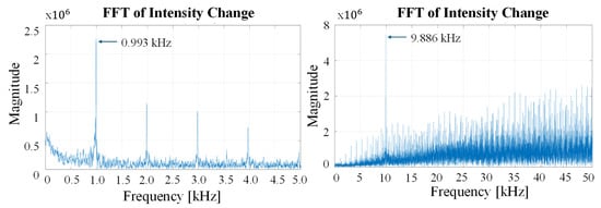 - Capillary Fluctuations:To investigate the dynamic behaviour of the capillary, it was hypothesized that the capillary opening and closing would be influenced by the corresponding beam oscillation. Whenever the capillary opens, the laser radiation would enter it and be scattered by the vapour particles present. This scattering would result in a periodic change in the intensity of the pixels within the capillary. A MATLAB script was written to quantify this behaviour, calculating the cumulative intensity of all the pixels grayscale values within the region of interest where the vapour capillary was formed. The cumulative sum of the grayscale values was then plotted against the frame number, depicting the time axis. Finally, a fast Fourier transform was performed on the intensity change data to identify the dominant frequencies.