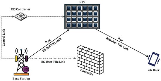 To address these limitations and unlock the full potential of THz communication in 6G networks, reconfigurable intelligent surfaces (RISs) has emerged as a promising enabling technology [,,]. An RIS consists of a large number of low-cost, passive reflecting elements whose electromagnetic response can be dynamically controlled to alter the propagation environment. By adjusting the phase shifts of each element, an RIS can redirect, focus, or scatter incident waves toward desired directions without requiring active RF chains or complex hardware [,,]. This passive beamforming capability makes RISs highly attractive for THz systems, where power consumption, hardware complexity, and propagation impairments are critical concerns [,,,]. In the context of 6G, RISs can be strategically deployed to create virtual line-of-sight (LOS) paths, bypass obstacles, compensate for severe path loss, and enhance spatial coverage, particularly in dense urban or indoor environments, where direct THz links are frequently blocked [,]. As a result, integrating RISs into THz systems represents a paradigm shift from adapting to the wireless environment to actively reconfiguring it, aligning perfectly with the programmable and energy-efficient vision of future 6G networks [,].