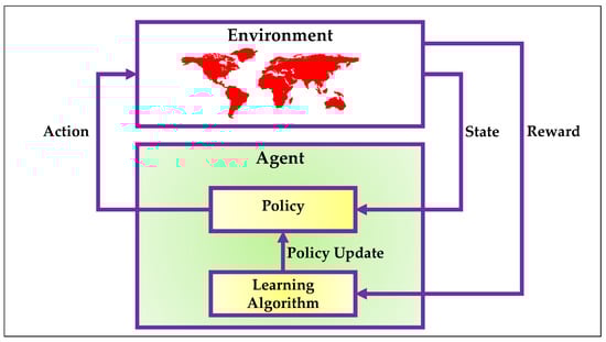 RL inherently accommodates sequential dependencies and delayed feedback, which are prevalent in real-world decision-making problems. Figure 3 illustrates the canonical RL architecture, where the agent and environment form a closed feedback loop. At each time step, the agent perceives the environment’s current state and selects an action based on its internal policy. This action results in a new environmental state and a reward signal. The agent then uses this experience to refine its policy via a mechanism known as policy updating. As this iterative process unfolds, the agent improves its behavior to maximize long-term rewards. This feedback-driven mechanism is central to how RL adapts and learns in dynamic conditions [].