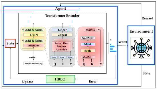 Figure 4 illustrates the proposed ODRL-Transformer framework, designed to maximize the sum rate in RIS-assisted THz communication systems. The architecture integrates a transformer encoder as the core sequence modeling component within the DRL agent while leveraging a novel HBBO algorithm to fine-tune critical hyperparameters across both the DRL and transformer modules. The system operates in a closed-loop fashion, where the agent observes the environment’s state, processes it through the transformer encoder, outputs an action policy, and receives reward feedback from the environment to refine future behavior. At the core of the agent lies the transformer encoder, which replaces the conventional DL modules typically used in RL pipelines. The transformer encoder processes sequences of observed states to extract rich temporal and contextual representations, enabling the agent to model long-term dependencies and capture complex interactions among channel dynamics, interference patterns, and RIS configurations. The self-attention mechanism allows the agent to selectively weigh past observations based on relevance, enabling superior adaptability in dynamically changing THz channels.