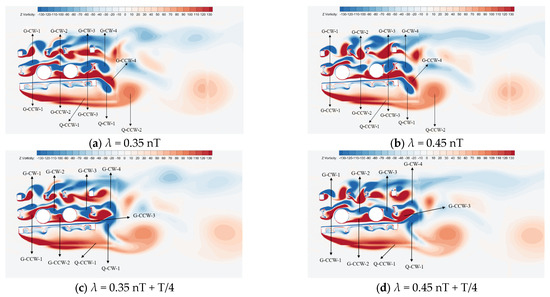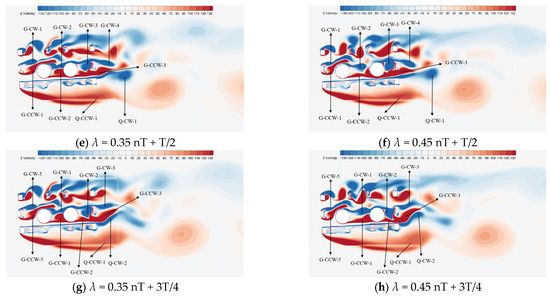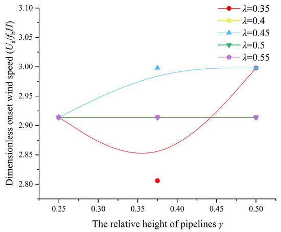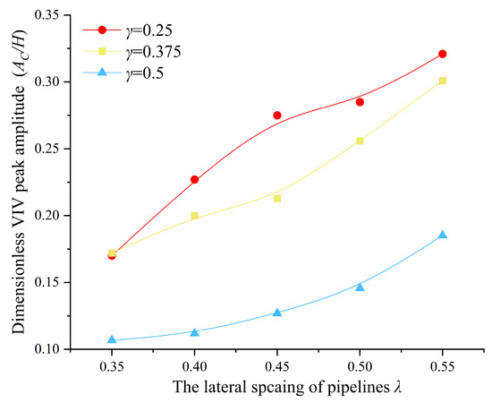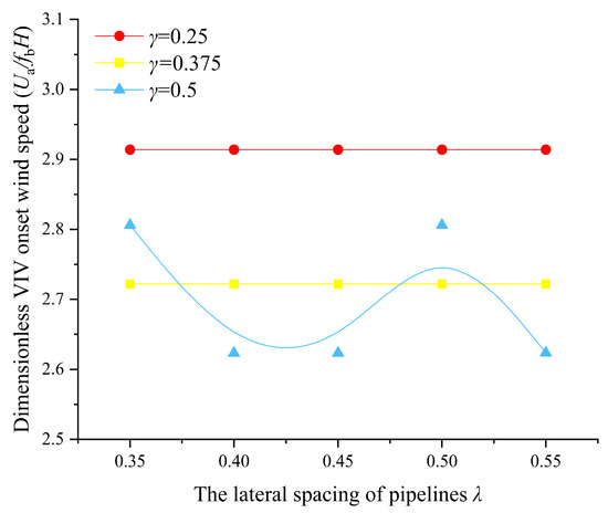 - As the lateral spacing of the pipelines λ increases, both the VIV amplitude and the lock-in interval length increase, while the VIV onset wind speed shows no clear trend. This overall indicates a deterioration in VIV performance. The increase in λ enhances the energy of the detached vortices on the windward side; thus, the impact force on the windward side pipeline also increases, leading to an increase in the energy of the surface vortices on that side, and resulting in a deterioration of the VIV characteristics.