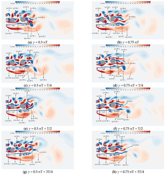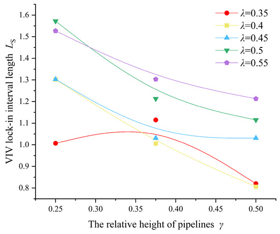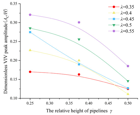 - As the relative height of the pipelines γ increases, both the VIV amplitude and the lock-in interval length decrease, while the VIV onset wind speed does not exhibit a consistent trend. These changes collectively indicate an improvement in VIV performance. The increase in γ leads to changes in the vortex structure on the windward side of the pipeline, with the impact point moving downward. The energy size of the vortex below the pipeline is strengthened, as well as the changes in the vortex energy on the pipeline surface and the separation point and reattachment point. This results in the emergence of counterclockwise vortices, thereby improving the vortex performance.
