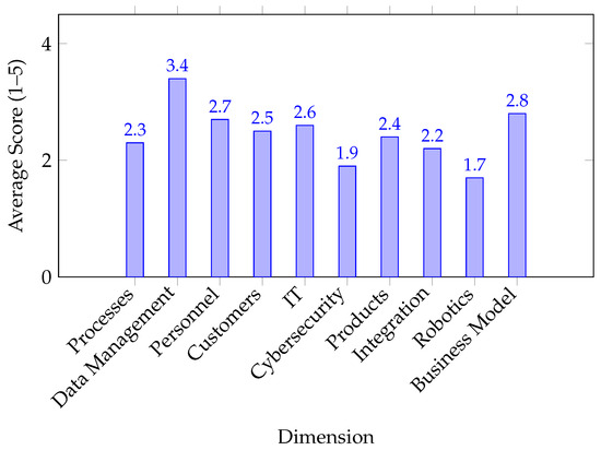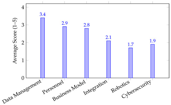 Figure 5 focuses on six dimensions of digital maturity that exhibited the most significant variability among the surveyed firms, thus highlighting both areas of relative strength and critical weakness. Data Management emerges as the most developed dimension, with an average score of 3.4, reflecting a moderate capacity to capture, store, and analyze business data. Personnel and Business Model follow with scores around 3.0, indicating incipient yet uneven integration of digital tools into workforce practices and value generation processes. By contrast, Integration, Cybersecurity, and Robotics remain significantly underdeveloped, each scoring below 2.2. These gaps underscore persistent deficiencies in inter-system connectivity, security protocols, and automation capabilities. Unlike Figure 1, which presents an overview of all ten dimensions, this figure isolates the most divergent results to illustrate the structural asymmetries that characterize the digital transformation of SMEs in the mining cluster.