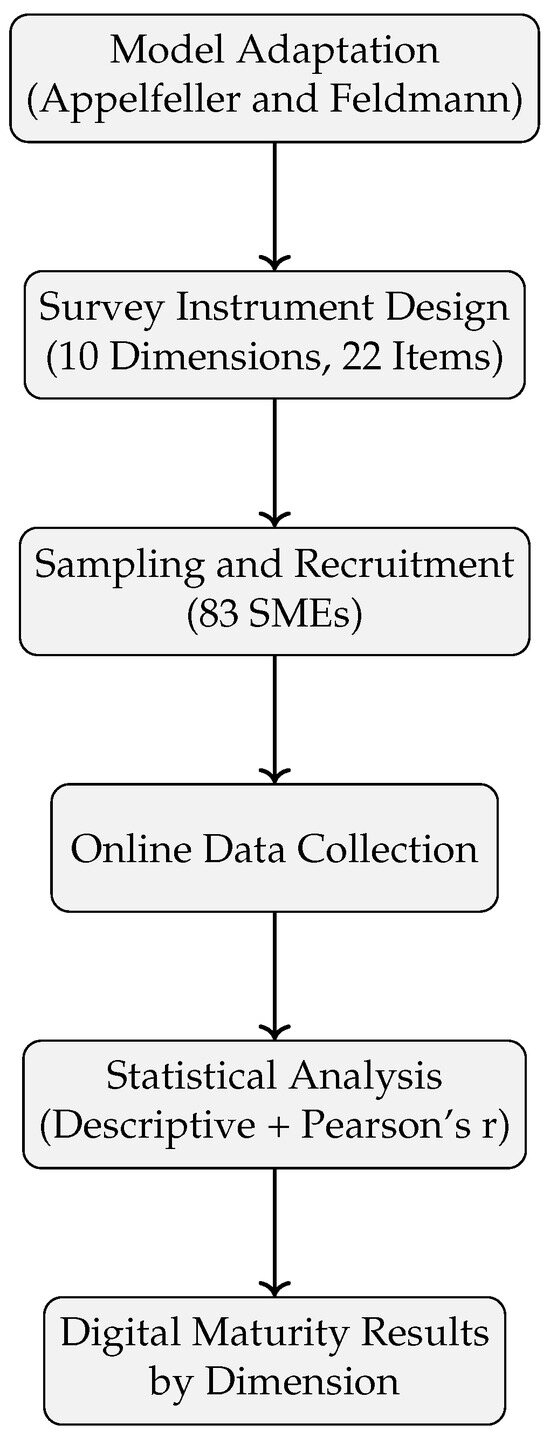 Methodological flow of the study from model adaptation to analysis of digital maturity data.