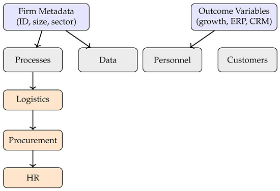 Figure 3 illustrates the logical architecture of the dataset, highlighting the relationship between firm-level metadata, dimensions of digital maturity, and the corresponding operational items. In the top layer, firm metadata such as identification code, firm size, and economic sector serve as key descriptors linked to dimensions such as “Processes” and “Data.” Outcome variables, including digital growth and the use of ERP/CRM systems, are associated with the “Personnel” dimension, reflecting their impact on human resource management practices. Each maturity dimension encompasses specific evaluation items; for example, “Processes” unfold into operational components like logistics, procurement, and human resources. This structure underpins both descriptive and inferential analyses, enabling a consistent mapping between the conceptual model and collected metrics.