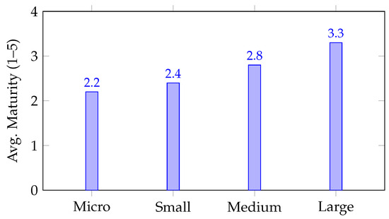 A fundamental benchmarking analysis was conducted to compare maturity levels between firm sizes. The companies were categorized as micro, small, medium, or large according to the number of employees, according to the official Chilean classification standards [17]. Figure 4 displays the average maturity scores by firm size.