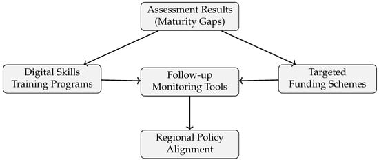 Figure 6 sensitizes a sequential pathway for translating diagnostic results into concrete policy actions. The process starts with the identification of maturity gaps that reveal specific weaknesses in the digital capabilities of firms. These findings inform two complementary lines of intervention: digital skills training programs and targeted funding schemes for technological upgrading. Both streams converge in a monitoring stage, where follow-up tools are applied to assess effectiveness and track progress. The final stage involves aligning the insights with regional policy frameworks, ensuring that organizational improvements scale into systemic benefits. Unlike prescriptive models, this framework operates as a set of strategic guidelines, promoting adaptive and evidence-based decision making to support SMEs in the Antofagasta mining cluster.