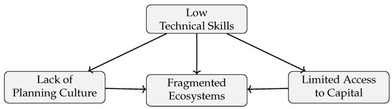 Figure 7 illustrates the primary structural barriers that hinder digital transformation efforts in small and medium enterprises (SMEs). At the core of these limitations is a widespread deficiency in technical skills, which constrains firms’ ability to adopt and sustain digital technologies. This weakness is compounded by the lack of a culture of strategic planning and restricted access to financial capital. These factors interact and ultimately contribute to fragmented ecosystems, where isolated initiatives fail to generate cumulative or systemic impact. The diagram emphasizes the need for holistic interventions that address human, organizational, and financial dimensions in tandem. Similar organizational and infrastructural barriers have been documented among Latin American SMEs, such as limited technical staff and financial constraints [22].